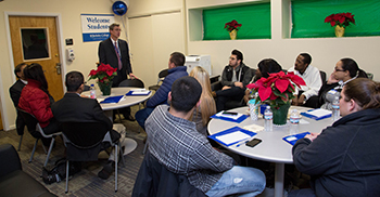Chris W. Grevesen (standing), PhD, Dean, Berkeley College School of Graduate Studies, addresses incoming graduate students during Winter 2017 Orientation. Berkeley College now offers a combined BBA/MBA dual degree program that gives students the option to complete both degrees in four years.