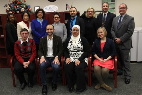 Seated from left, Princeton University doctoral students Daniel Berbecel (Comparative Politics), Merle Eisenberg (History), Sarah Islam (Near Eastern Studies) and Hope Rogers (English); standing, from left, Dr. Alexandra Salas, MCCC Dean for Innovation, Online Learning and Student Success; Dr. Jianping Wang, MCCC President; MCCC faculty mentors Laura Sosa (Business Administration), Diane Rizzo (English), and Dr. Daniel Schermond, (Sociology); Amy Pszczolkowski, Princeton University’s Assistant Dean for Professional Development in the Office of the Dean of the Graduate School; Dr. Robert Kleinschmidt, MCCC Dean for Liberal Arts, and Dr. David Edwards, Vice President for Academic Affairs. Not pictured: MCCC faculty mentor Holly-Katharine Johnson (English).Princeton Graduate Students Head to Mercer County Community College to Prepare for Teaching Opportunities