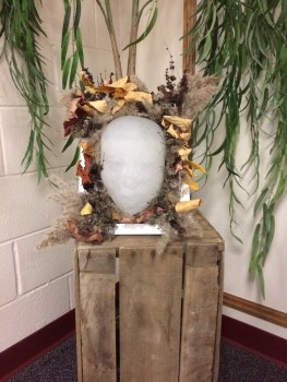 Amburg described her first-place piece and its inspiration: “My work is a kiln-cased glass mask with a fall arrangement surrounding it. I am showing my past as well my future with this piece, but I am also showing myself….When fall time comes, it fills me with so much joy because it is then when I feel like my real self and can take the mask off that I hide behind to be myself. ”