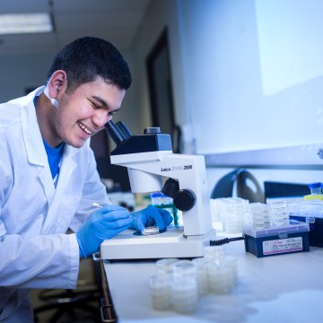 tered the University with a plan: medical school. He became interested in laboratory research after attending a presentation on fetal alcohol syndrome given by Assistant Professor of Biology Maria Agapito, Ph.D.