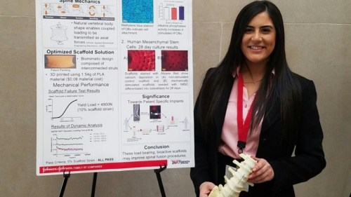 Stevens Institute of Technology biomedical engineering Ph.D. candidate Constance Maglaras, principal designer of the patent-pending technology, was recently awarded top prize in the graduate-poster division at Johnson & Johnson’s 2017 Engineering Showcase for her poster and presentation, “Interconnective Strut Based, Bioresorbable Bone Scaffolds: The Future of Orthopaedic Fusion.”