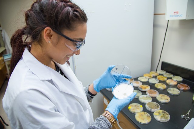 Sameerah Wahab, a biology major and NASA STEM Fellow at Brookdale Community College in Monmouth County, inspects a variety of fungus as part of a year-long research project. Photo by Brookdale Community College.