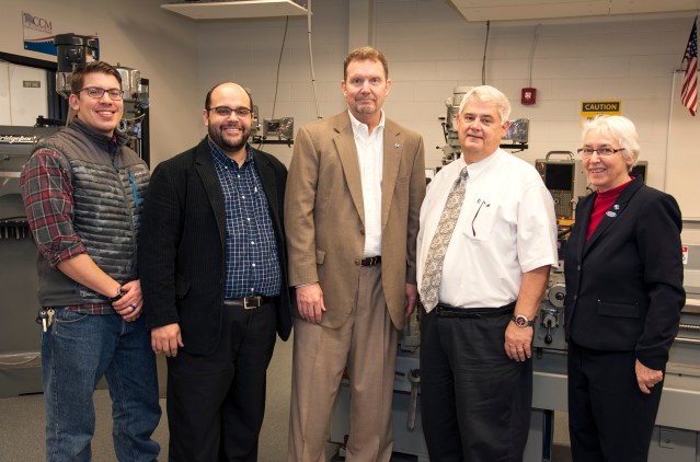 Caption: (l-r): Eric Pederson, County College of Morris (CCM) lab assistant for engineering programs; Tom Roskop, assistant professor, engineering technologies at CCM; Blake Ratcliff, HUNCH program manager; Stacy Hale, HUNCH founder; Dr. Florence Gold, NASA HUNCH implementation project manager, in one of the engineering labs at CCM. Credit: John Hester