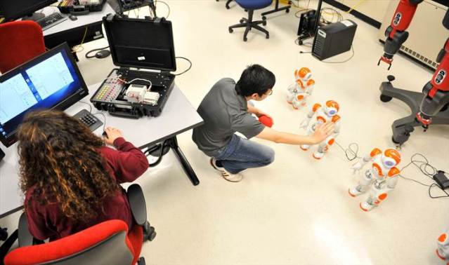 Nathalie Peralta runs a computer program to control a Nao humanoid robot, while Ryan Choy gives a wave to test its sensory capabilities. Both are juniors and electrical engineering majors.