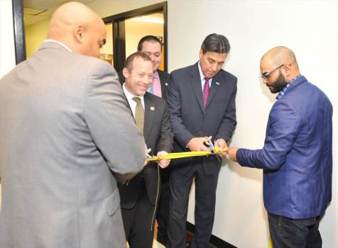 Congressman Josh Gottheimer (L) and University President Christopher Capuano (R) cut a symbolic yellow ribbon as Ariel Luna, former director of veterans services; senior John Myles, president of the FDU Student Veterans Association; and Mariano Cappelan, MBA student and alumnus, BA’16 (Metro), look on. The event celebrated the opening of the new veterans resource center on FDU’s Metropolitan Campus. (Photos by Dan Landau)