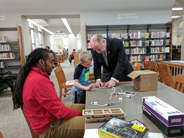 Elizabeth Mayor J. Christian Bollwage tinkers with circuits with a participant while Union student Xavier Tavares oversees the process.