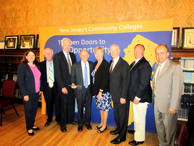 The Governor’s Higher Education Council accepts the Community College Spirit Award from the NJ Council of County Colleges for prominently featuring community colleges in its efforts to increase postsecondary attainment throughout New Jersey. Pictured, from left: Patricia Nachtigal, John Wefing, Dr. Richard Wellbrock, Council Chairman John McGoldrick, NJCCC Chair Helen Albright, Robert Campbell, NJ Community College Presidents Chair Dr. William Austin, and NJCCC President Dr. Lawrence Nespoli.