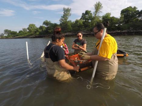 Last summer, NJCU biology students Raysa Dominguez, Margaret Ramirez, and Marily Ruiz (pictured left to right) worked with their professor, analyzing samples from the oyster reef. They measured samples for size and listed all invertebrate organisms found. The students were supported on their summer research projects through grants to the Biology Department from the U.S. Education Department Minority Science & Engineering Improvement Program (MSEIP) and the Hispanic Serving Institution (HSI) STEM grants to the Biology Department.