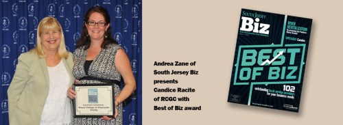 Andrea Zane of South Jersey Biz presents RCGC’s Dr. Candice Racite with the “Best of Biz” award for the College’s Cooperative Education program.