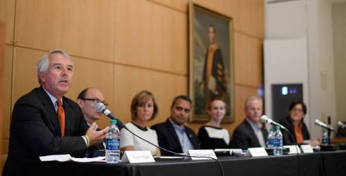A panel discussion on building a hub of research and innovation in New Jersey included, from left, Robert Hugin of Celgene Corporation, Leslie Greengard of the Flatiron Institute, Debbie Hart of BioNJ, Prakash Balan of the National Science Foundation, Elizabeth Bruce of Microsoft, William Welsh of Rutgers University, and Jennifer Rexford of Princeton University. Photo by Sameer A. Khan/Fotobuddy.